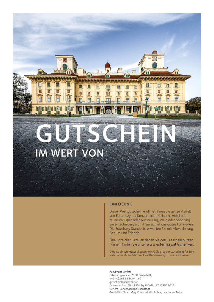 Schenken Sie faszinierende Einblicke in die Vergangenheit bei einer Führung durch das Schloss Esterházy. Die Schloss Boutique bietet eine erlesene Auswahl an Geschenkartikeln, Weinen und pannonischen Köstlichkeiten. Eine Übersicht über die aktuellen Ausstellungen finden Sie hier. Wofür der Wertgutschein aber letztlich eingelöst wird, steht dem Beschenkten frei. Auch unsere anderen Empfehlungen stehen zur Auswahl.